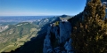 Départ sur la route entre Léoncel et Bouvante au niveau du lieu-dit le Bouvaret. Le sentier qui monte dans la prairie débute par une élingue tendue entre deux poteaux. C’est par là, ça monte en zig-zags dans la prairie jusqu’à la côte 932m ou là, il faudra partir sur une sente à droite qui monte en lacets parfois marquée d’un point rouge parfois de quelques morceaux de rubalise. Le sentier n’est pas toujours très visible mais il se devine. A la côte 1095 vous allez rejoindre un beau sentier de traverse. Il faut le prendre par la droite en gardant la même courbe de niveau jusqu’à la côte 1063m. Là, il faudra monter sur votre gauche en suivant les points rouge. Vous arrivez en bord de crête au cou de la momie. Partez en suivant la crête sur la droite. Passage avec les mains mais très facile. Suivez le bord de crête pour descendre dans la forêt et rejoindre le Pas de Bouvaret. Descendez sur la gauche en direction de Rochefort Samson. A la côte 880m au panneau indiquant St Genis, vous quittez le sentier principal pour partir juste derrière le panneau sur la piste qui monte. A la fourche suivante côte 776m continuez sur la piste de droite. C’est visiblement un endroit peu fréquenté alors gardez le cap même si la piste disparaît à certains endroits. Vous allez vous retrouver à un carrefour de piste avec un panneau sur votre droite qui vous indique la montée vers le Pas de la Pierre. C’est parti pour une montée pas si facile. Au Pas de la Pierre ce sera tout droit suivez le GR9 en direction de Bouvaret. Restez toujours sur le GR9 en direction de Léoncel et vous retrouverez votre point de départ. Bonne rando.